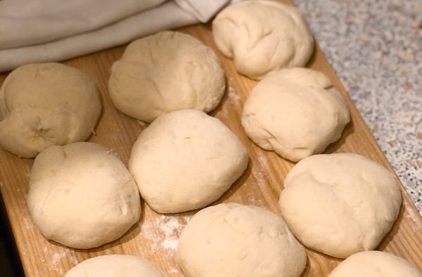 Then make about 8 pieces from the dough, and shape them into small buns, then put them on floured plates and leave them to rise for further 15-20 minutes. Once they’re ready, pull each of the buns with your hands (like a pizza dough) and make them as flat as possible. Do only one at a time! As they do have a tendency to shrink back. Once you have a desired size and thickness, put them on a pan with hot oil - there should be enough oil for the langoše to float in it! Leave just for a few minutes until golden and flip.