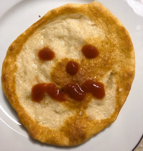 Nearly forgotten, years later we made them at home and fell in love again. And so it happened that one time we made them on Halloween and I made a scary face on them with the ketchup. And a new tradition was born.